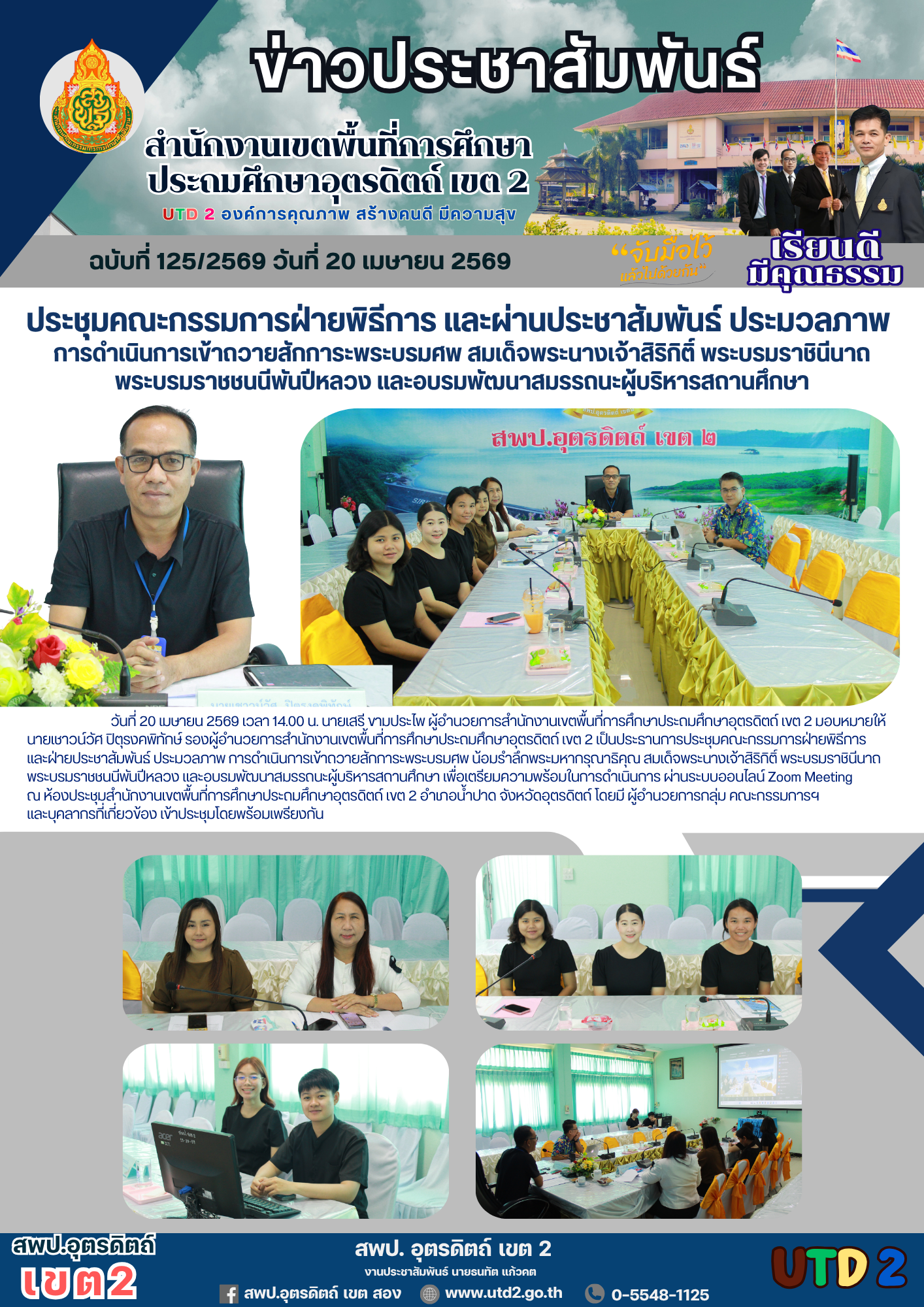 ฉบับที่ 125/2569 ประชุมคณะกรรมการฝ่ายพิธีการ และผ่านประชาสัมพันธ์ ประมวลภาพ การดำเนินการเข้าถวายสักการะพระบรมศพ สมเด็จพระนางเจ้าสิริกิติ์ พระบรมราชินีนาถ พระบรมราชชนนีพันปีหลวง และอบรมพัฒนาสมรรถนะผู้บริหารสถานศึกษา