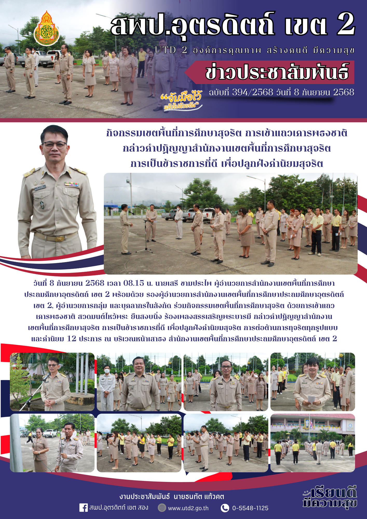 ฉบับที่ 394/2568 กิจกรรมเขตพื้นที่การศึกษาสุจริต การเข้าแถวเคารพธงชาติ กล่าวคำปฏิญญาสำนักงานเขตพื้นที่การศึกษาสุจริต การเป็นข้าราชการที่ดี เพื่อปลูกฝังค่านิยมสุจริต
