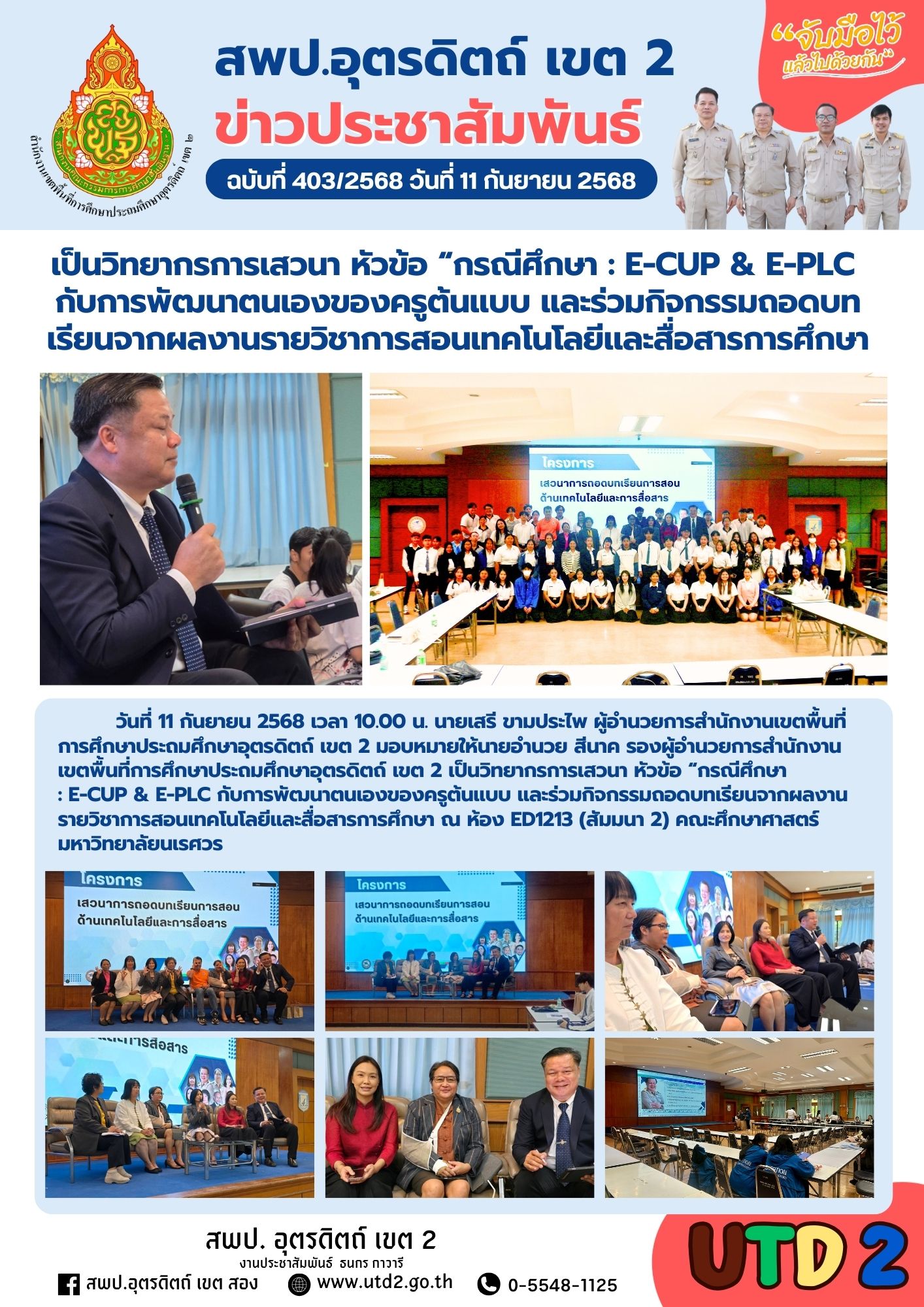 ฉบับที่ 403/2568 เป็นวิทยากรการเสวนา หัวข้อ “กรณีศึกษา : E-CUP & E-PLC กับการพัฒนาตนเองของครูต้นแบบ และร่วมกิจกรรมถอดบทเรียนจากผลงานรายวิชาการสอนเทคโนโลยีและสื่อสารการศึกษา