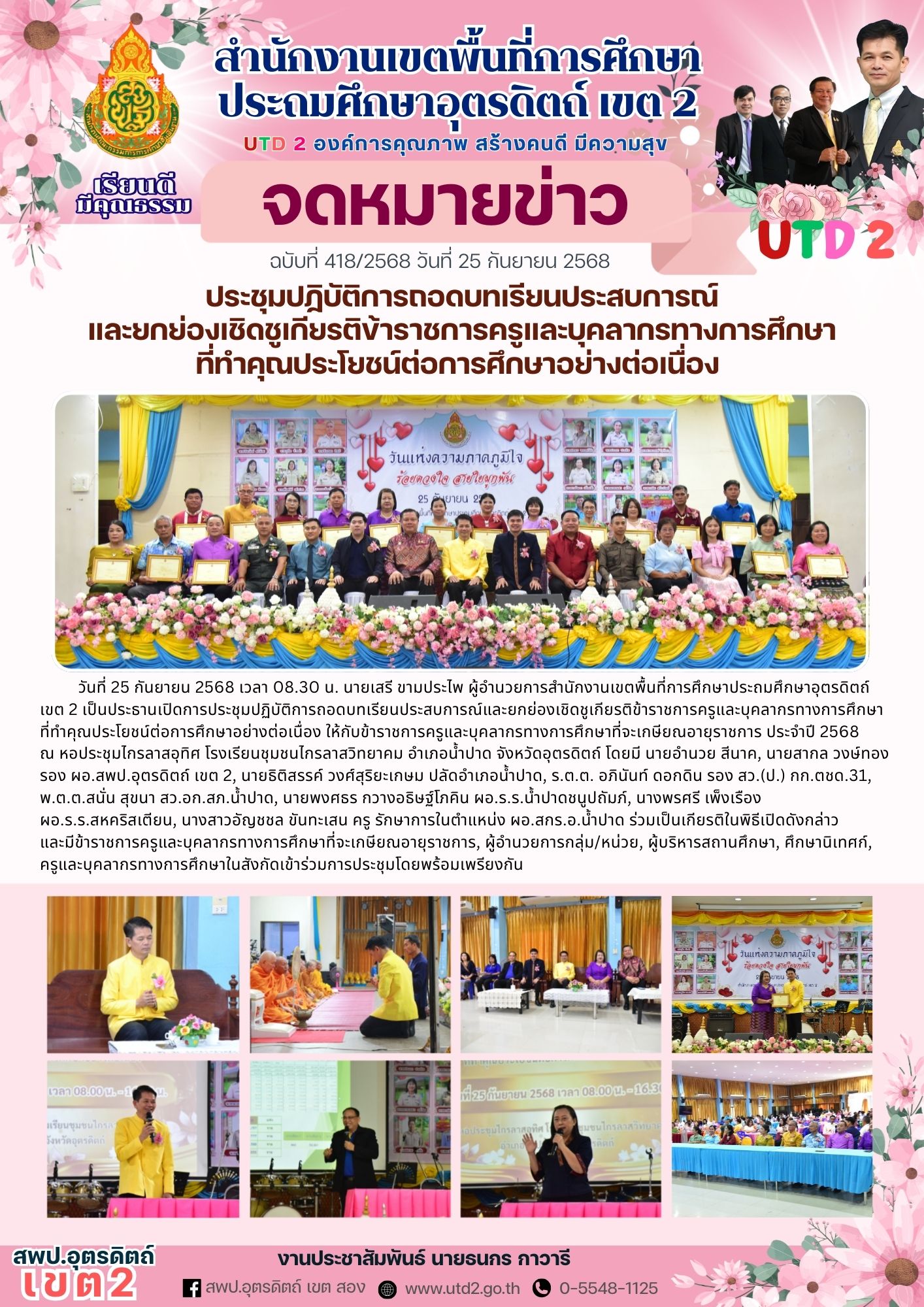 ฉบับที่ 418/2568 ประชุมปฏิบัติการถอดบทเรียนประสบการณ์ และยกย่องเชิดชูเกียรติข้าราชการครูและบุคลากรทางการศึกษาที่ทำคุณประโยชน์ต่อการศึกษาอย่างต่อเนื่อง