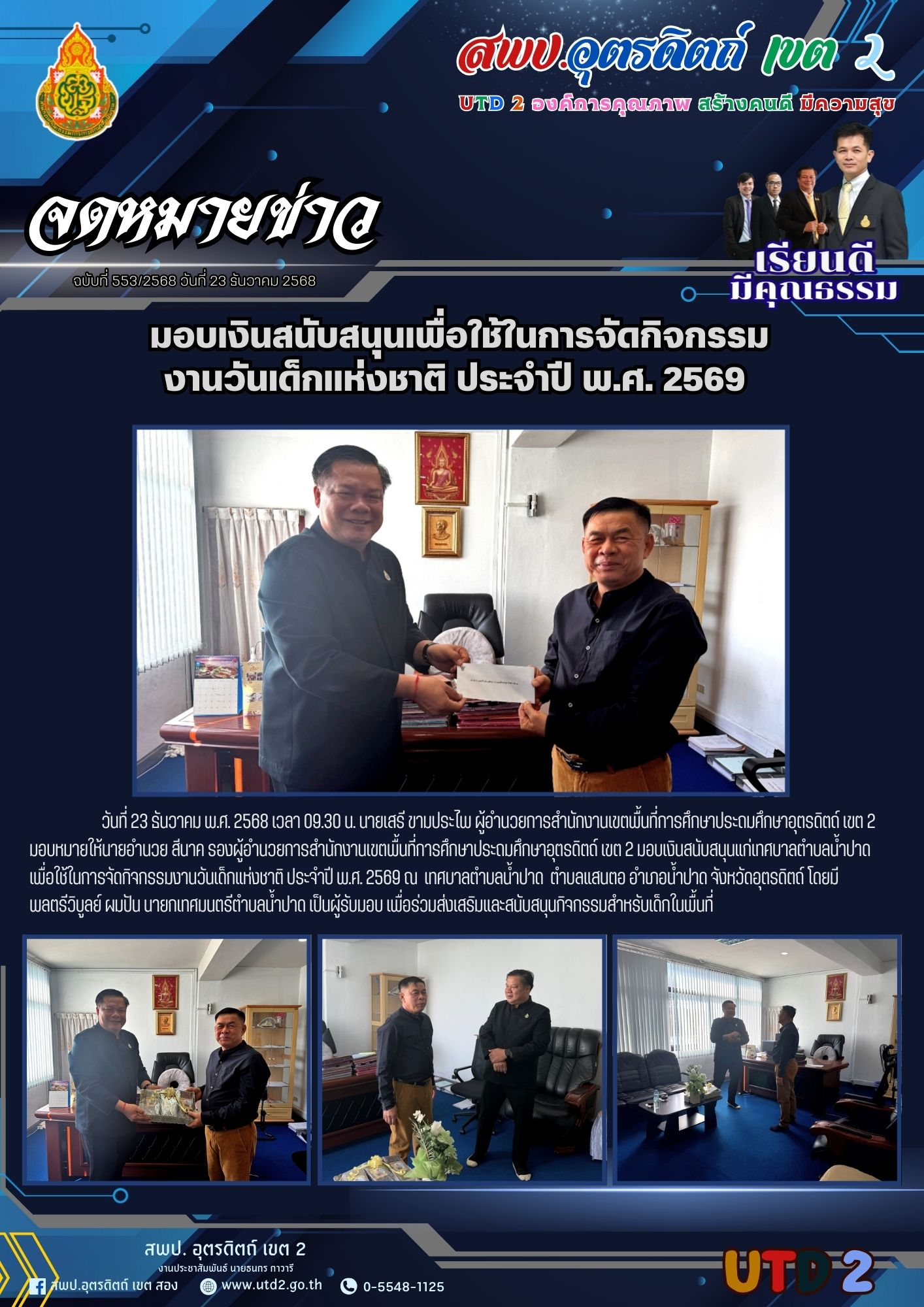 ฉบับที่ 553/2568 มอบเงินสนับสนุนเพื่อใช้ในการจัดกิจกรรม งานวันเด็กเเห่งชาติ ประจำปี พ.ศ. 2569