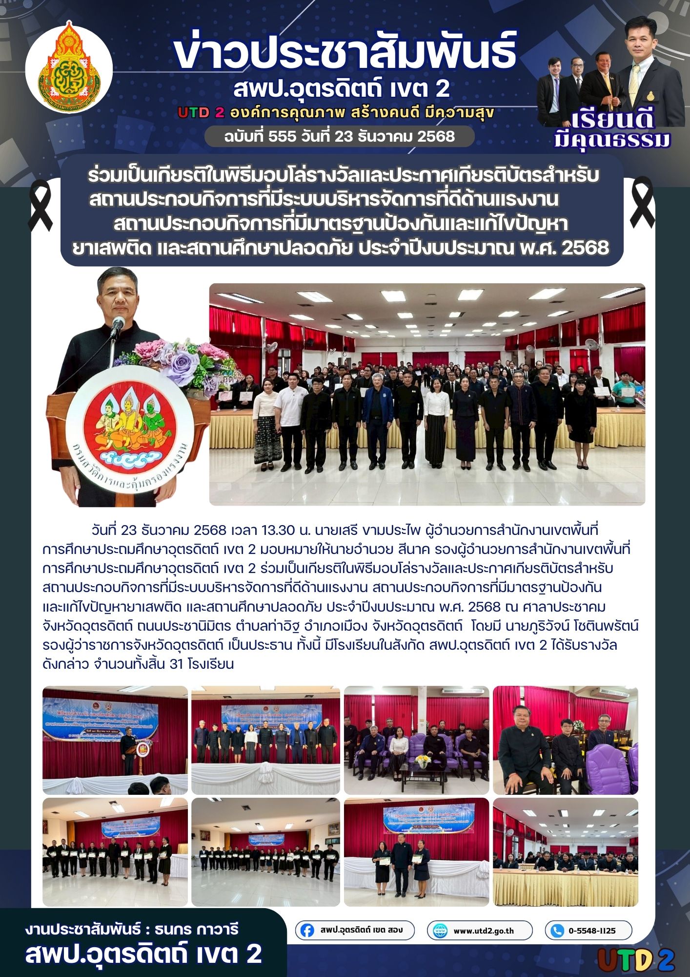 ฉบับที่ 555/2568 ร่วมเป็นเกียรติในพิธีมอบโล่รางวัลและประกาศเกียรติบัตรสำหรับ สถานประกอบกิจการที่มีระบบบริหารจัดการที่ดีด้านแรงงาน สถานประกอบกิจการที่มีมาตรฐานป้องกันและแก้ไขปัญหายาเสพติด และสถานศึกษาปลอดภัย ประจำปีงบประมาณ พ.ศ.